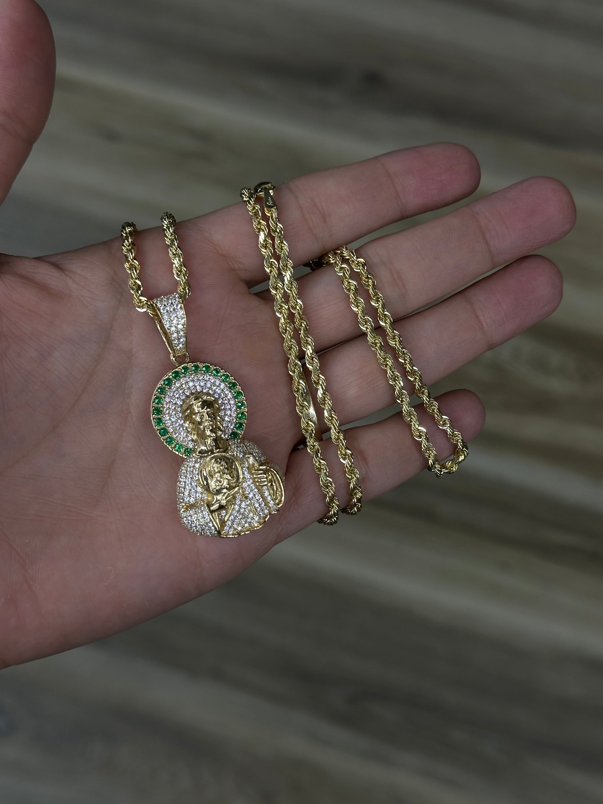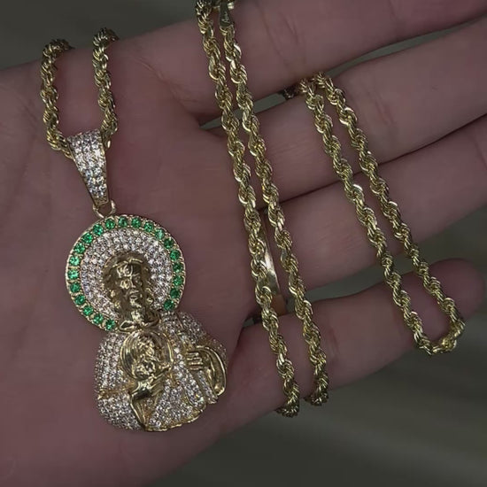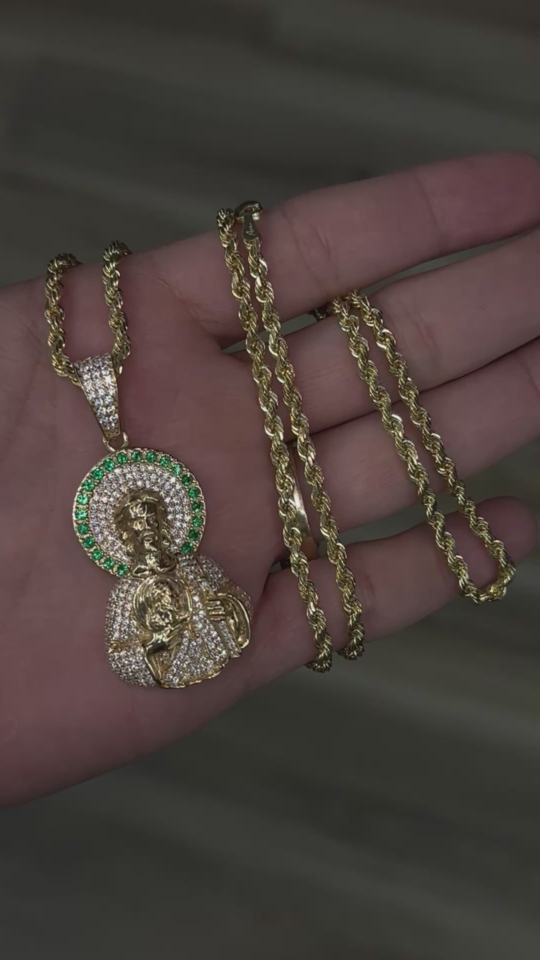 14k Cubic Zirconia Half Body San Judas Pendant Paired with 14k 24” Solid Rope Chain