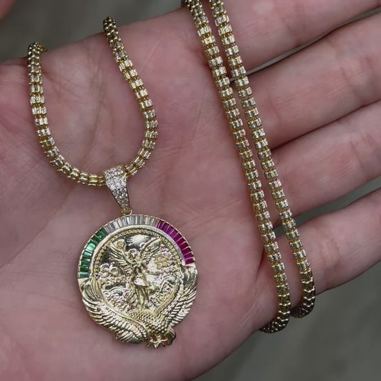 14K Centenario Coin framed in a shimmering CZ bezel paired with a 22” Ice Chain