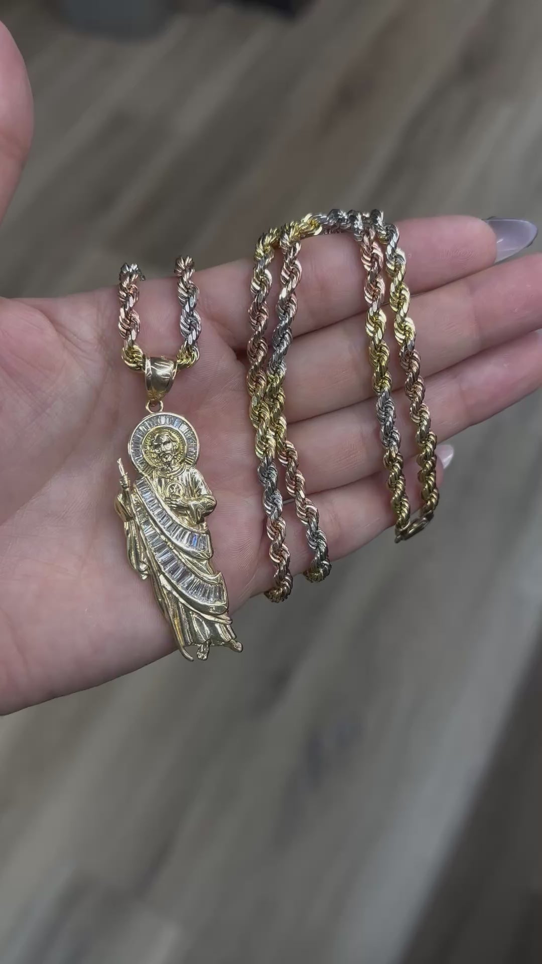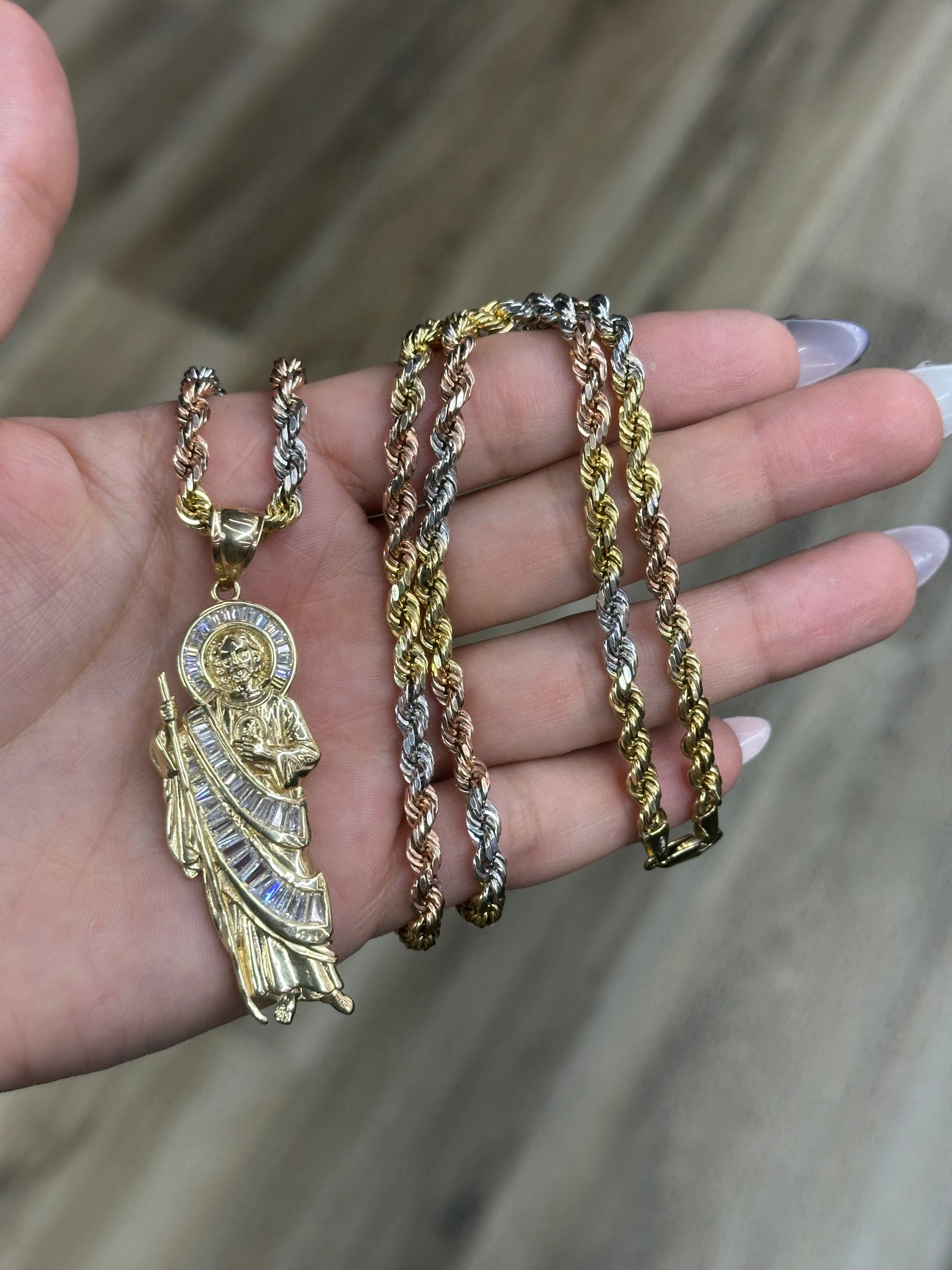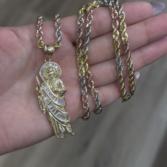 14k 26” Tri- Color Rope Chain paired with a 14K Emerald CZ San Judas Pendant