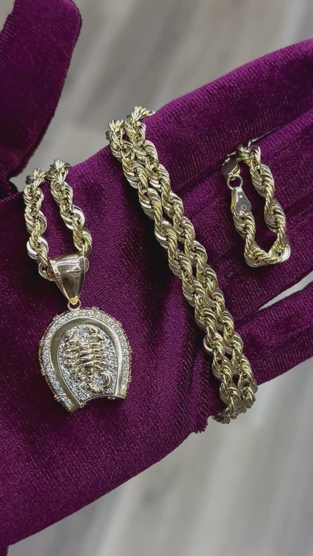 14k 24” Hollow Rope Chain paired with 14k 1.5 inch CZ Scorpion Pendant